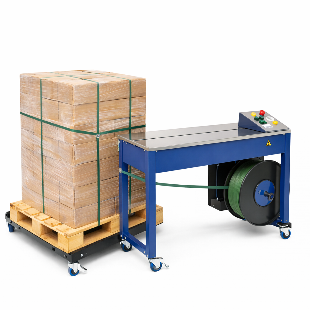 Le cerclage palette semi automatique permet de gagner en efficacité tout en conservant un contrôle sur le processus de cerclage. L’opérateur positionne le feuillard, tandis que la machine assure le serrage et la coupe.